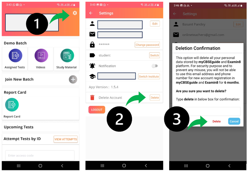 Follow the steps below to delete your all personal data stored by Examin8 App (https://play.google.com/store/apps/details?id=com.examin8.exam)